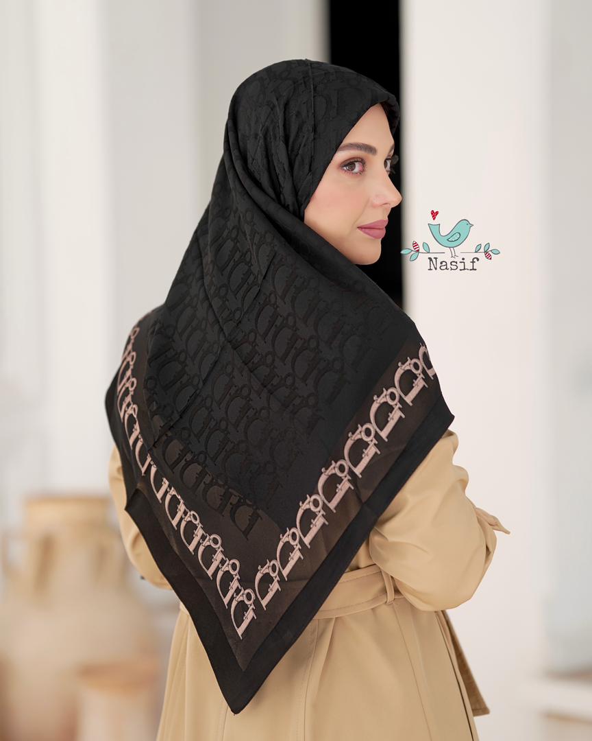 روسري ابريشم دووره ترك قواره ١٢٠ كاملا مشكي با طرح برجسته