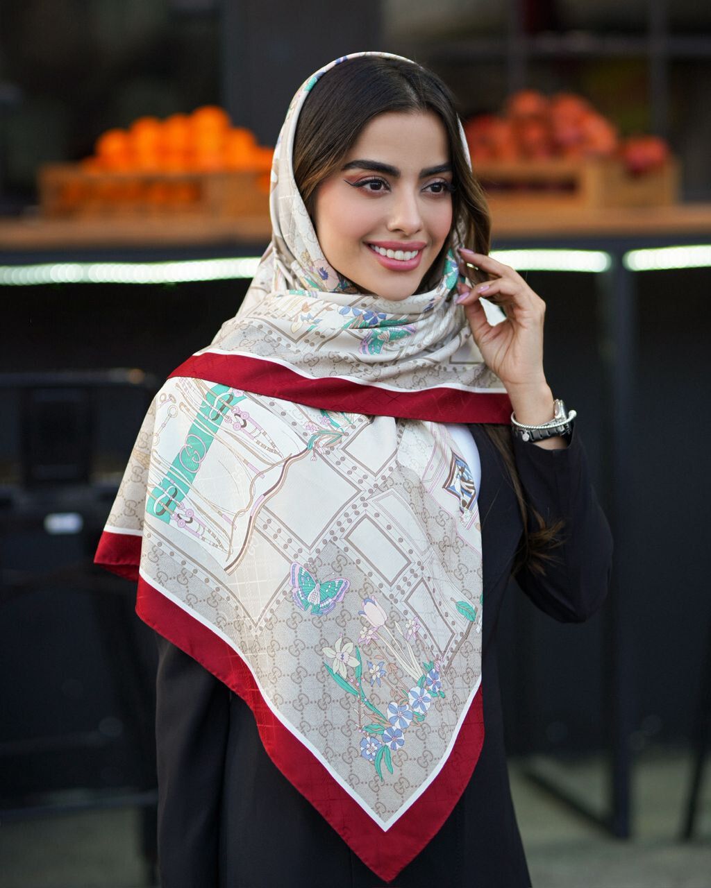 روسري مجلسي ابريشم ژاكارد وارداتي درجه يك به قواره ١١٠ دور دست دوز با ايستايي عالي ، ارسال رايگان پستی